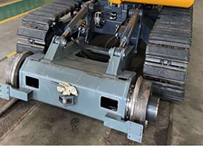 安裝鐵路導向輪,履帶板采用橡膠板,能實現在鐵路線路上自由上下道,并確保在鋼軌上行走而不會損傷鋼軌。